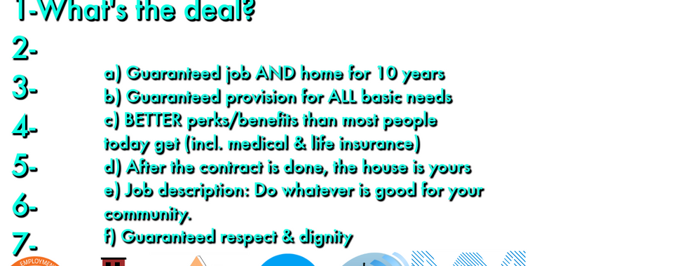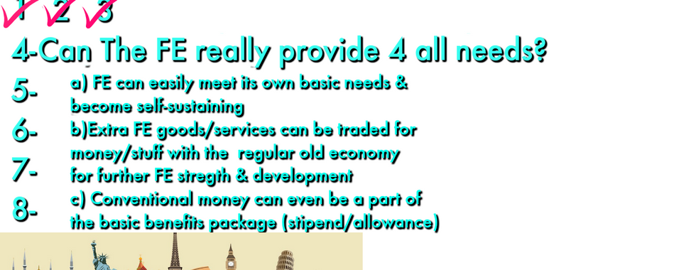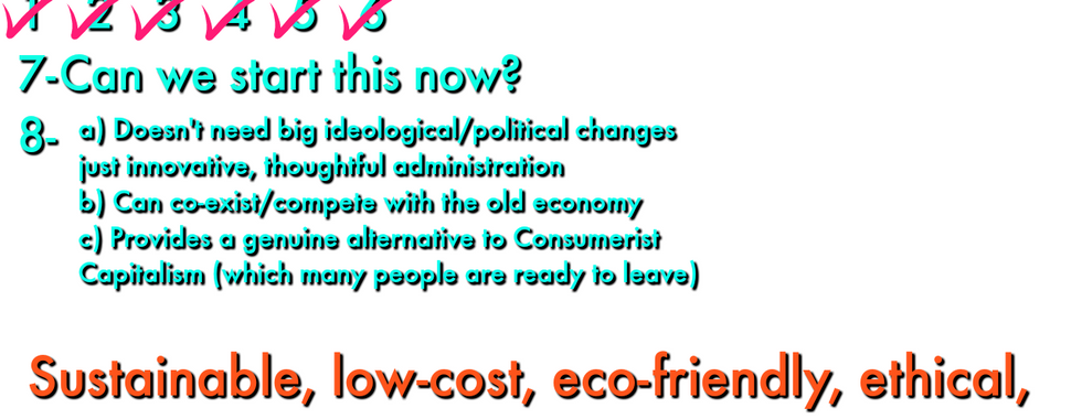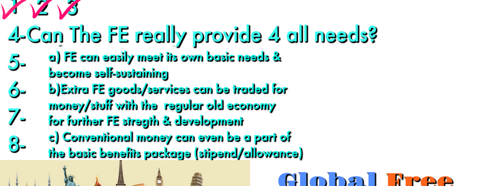 "That's all well and good, DP. I mean, great offer, but how are you going to pay for all those homes and feed/train all those people?" Well, all those previously unemployed people will be put to work making all the things that they themselves need. They just need to be organised efficiently. I think people won't really mind, if they have a home/environment they're happy with, and of course a steady stream of life essentials (e.g. food, water, clothing, etc.), none of which really need to be bought! In other words, if people are making and distributing things (for themselves) without using (bank-issued) money, then the system doesn't really need much. And if there are extra goods/services produced in TheFREEconomy, they can be sold to the bank-dominated economy, or swapped, for stuff not yet producible in TheFREEconomy.